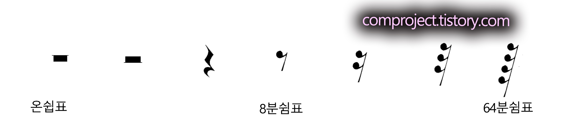 쉼표의 체계도 음표와 동일합니다. 이름도 동일하니 자세한 설명은 생략하고 쉼표들을 소개하겠습니다.
