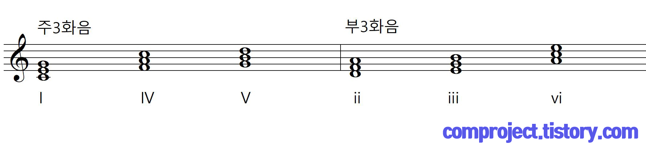 위와 같은 방법으로 ii-iii-vi도 화음이 되며, 부3화음이라 합니다.