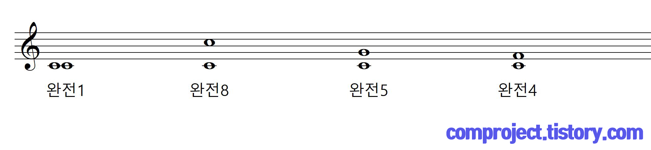 그 다음은 어디일까요? 앞선 포스팅에서 설명한 ‘배음’파트를 유심히 공부하셨던 분들은 아마 맞추실 수 있을 것입니다. ‘완전5도’가 잘 어울립니다. 그다음은? ‘완전4도’입니다.