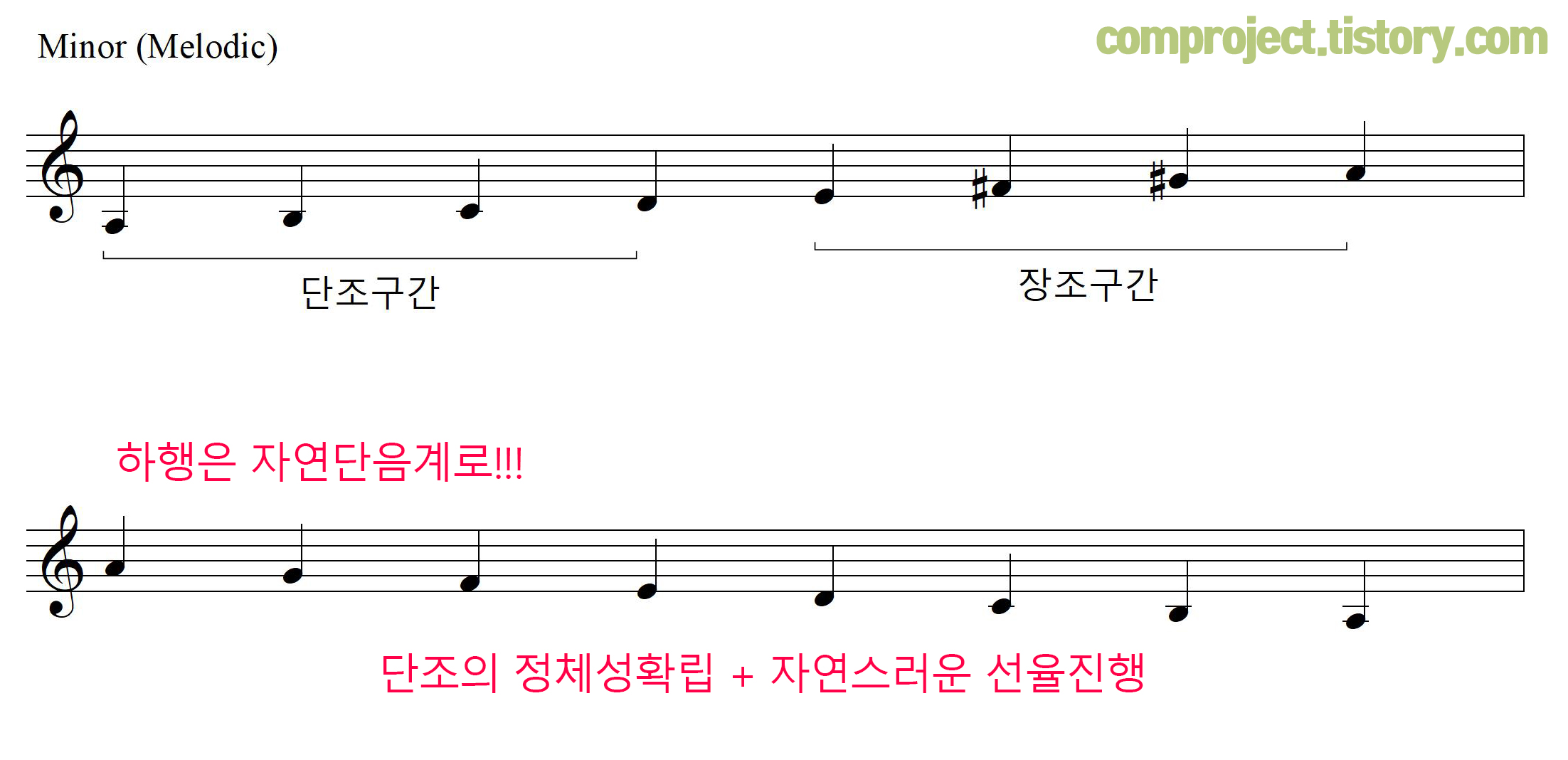 선율로 들었을 때 멜로디에 힘을 주면 가락단음계, 그러나 가락단음계는 단조+장조 구성이 되므로 정체성을 확실하게 하기 위해 하행선율에서는 자연단음계로 내려와야 합니다.