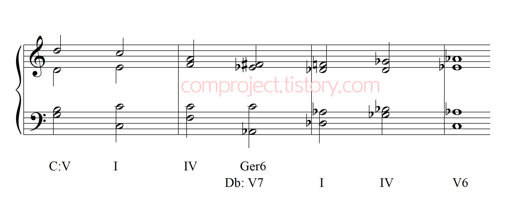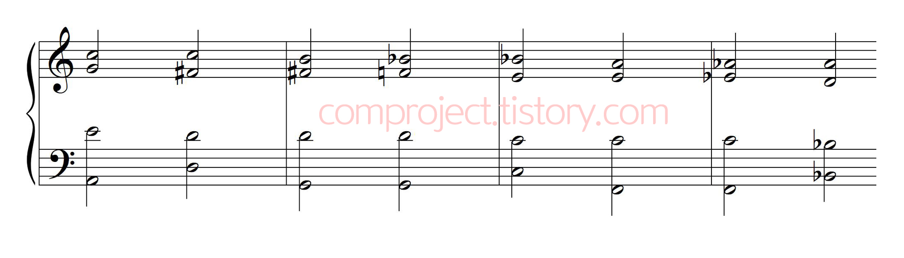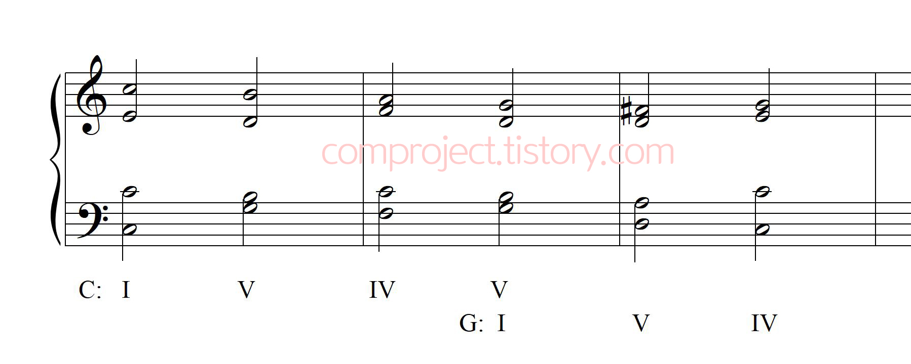 화성학책에 가장 첫 번째로 나오는 전조입니다. 온음계적 전조는 가장 자연스럽게 이루어지는 전조를 뜻합니다만, 이것은 음악 구조상 자연스러운 것이지 귀로 들을 때 자연스러운 것은 아닙니다.