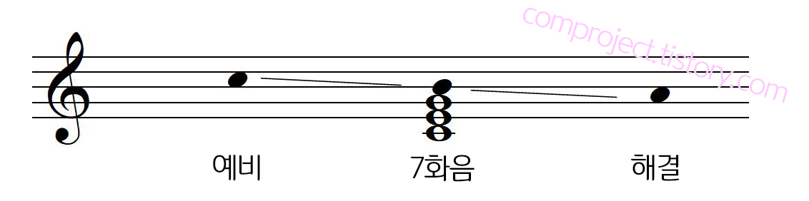 성부진행이 중심이 되는 정통화성학에서는 화음이 자연스럽게 연결되는 것을 선호합니다. 19세기 음악에서 가장 싫어하는 것은 ‘불협화음’이 근거 없이 나오는 것과 성부의 독립성이 침해당하는 것입니다. 여기서 sus4는 불협화음측면에서 예비-화음-해결을 지켜야 합니다. 모든 불협화 음정이 나오는 화음은 성부진행을 자연스럽게 만들어야 합니다. 화음을 이루기 전에 동일한 음이 먼저 나오는 것을 ‘예비’라 하며 화음이 나오고 2도 하행하는 것을 ‘해결’이라 합니다. 정통화성학에만 등장하는 것 같으나 사실 재즈화성에서도 텐션-해결의 형태로 자주 나오는 개념입니다.