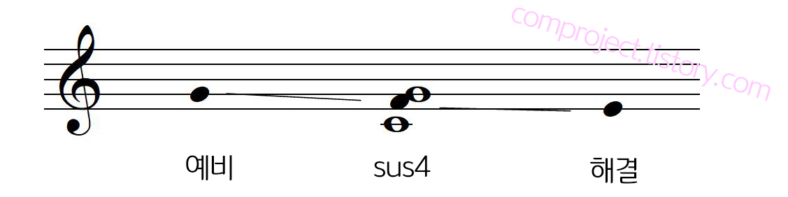sus4는 3화음의 3음이 1도 올라와서 근음과 4도 관계를 이룹니다. 정통화성학에서는 계류음(suspantion)이 해결되지 않은 형태로 취급합니다. 따라서 sus4의 4도음은 반드시 1음을 낮춰서 3음으로 해결을 해줘야 합니다. 그러나 대중음악에서는 해결을 하지 않고 화음의 색채감을 활용하는 용도로 사용하는 경우도 있습니다.